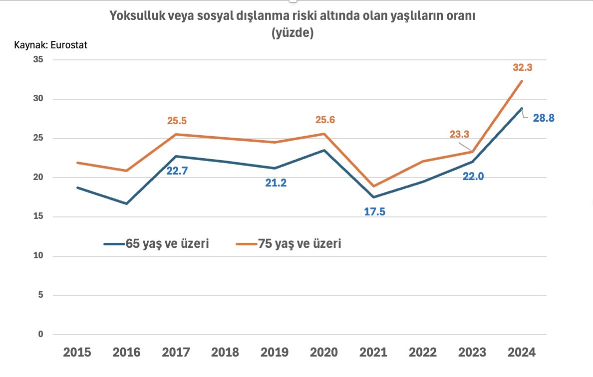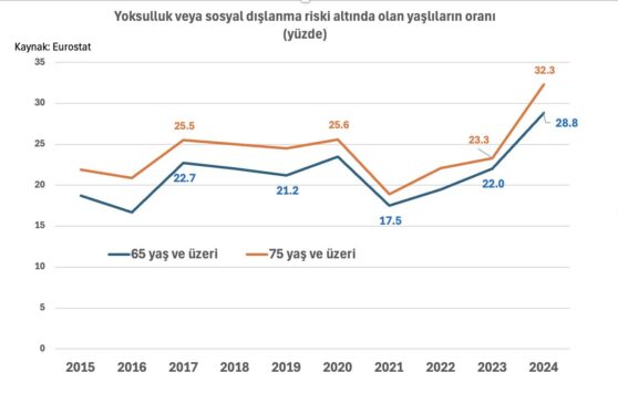 Eurostat verilerine göre, Türkiye’de yoksulluk veya sosyal dışlanma riski altındaki 65 yaş ve üzeri nüfusun oranı, 2015 yılında yaklaşık yüzde 18,5 seviyesindeyken, 2024’te yüzde 28,8’e yükseldi. Aynı dönemde 75 yaş ve üzeri nüfusta bu oran yüzde 21–22 bandından yüzde 32,3’e çıktı.