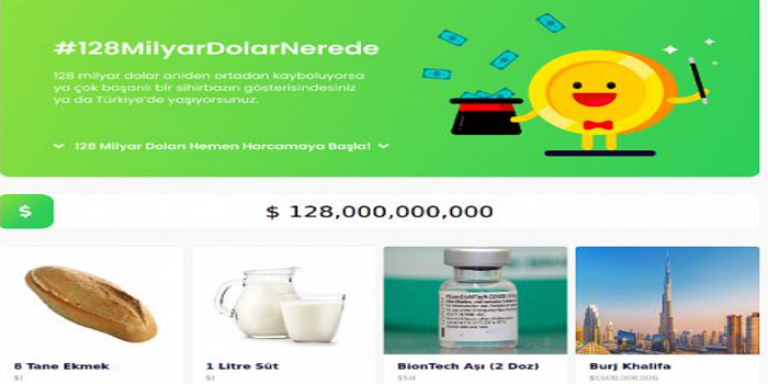 Site üzerinde yer alan ürünlerden hayali alış veriş yaparak 128 milyar dolarla neler alınabileceği hesaplanıyor. Ekmek, 20 kilo soğan ve patates, 35’li çokomel, 5 litre ayçiçek yağı, iPhone, Porsche Cayenne, havuzlu villa ve Biontech aşısı gibi ürünlerden istediğiniz kadarını seçtikten sonra harcamayı bitir seçeneğini tıklayınca ne kadar tuttuğu ve 128 milyardan ne kadar kaldığı bilgisi veriliyor.