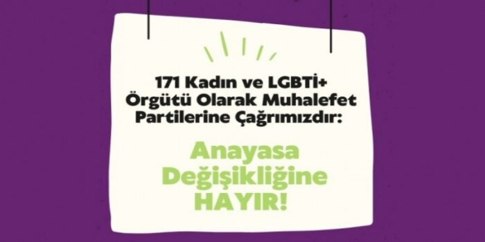 Anayasa’da değişiklik önerilerini içeren teklife karşı açıklama yapan 171 kadın ve LGBTİ+ örgütü, “Teklif, sadece Anayasa’nın ruhuna ve evrensel insan hakları normlarına aykırı ve ayrımcı olmakla kalmayıp, Anayasa yapım tekniği biçimiyle de kabul edilemez” dedi.
