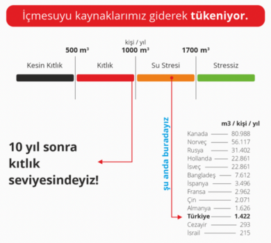 Ülkemizde de durum tehlike çanları çalıyor noktasında. “Türkiye İstatistik Kurumu (TÜİK) tarafından yayımlanan 2017 yılı adrese dayalı nüfus verileri kullanılarak hesaplandığında, Türkiye’nin kişi başına düşen yıllık kullanılabilir su miktarının 1.400 m3 civarında olduğu görülmektedir. Buna göre Türkiye su azlığı yaşayan bir ülkedir. 2040 yılı için nüfusumuzun yaklaşık 100 milyon olacağı öngörülmektedir. Bu durumda, 2040 yılı için kişi başına düşen kullanılabilir su miktarının yaklaşık 1.120 m3 olacağı hesaplanmaktadır. Bu durum, Türkiye’nin gelecekte su sıkıntısı çeken ve su stresi olan bir ülke olma ihtimalini göz önüne sermektedir.”
