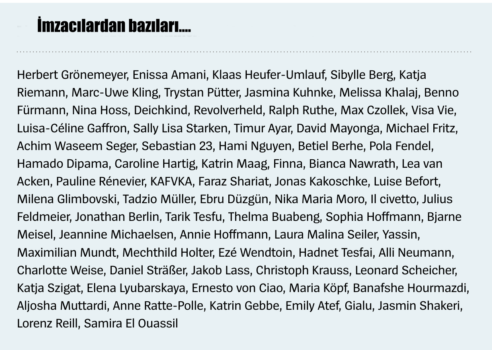 Cuma günü birçok gazetede yayımlanan açık bir mektupta, film, müzik, edebiyat ve tiyatro alanlarında faaliyet gösteren 100’den fazla ünlü, Avrupa’da insani ve dayanışmacı bir sığınma politikası talep ediyor. Mektuba, Sibel Kekilli ve Katja Riemann gibi oyuncular, Peter Maffay ve Herbert Grönemeyer gibi müzisyenler, Juli Zeh gibi yazarlar ve Fatih Akın gibi yönetmenler imza attı.
