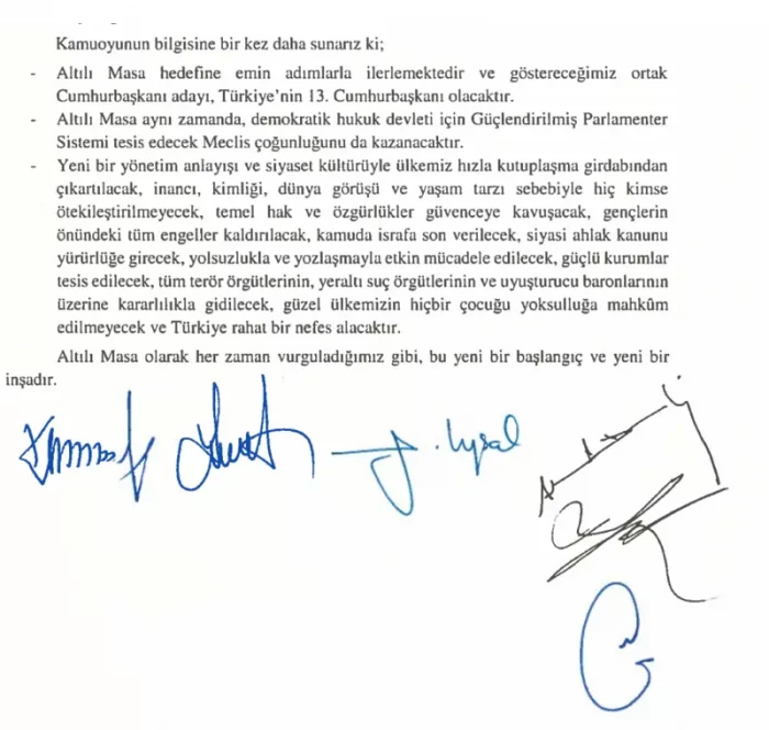 “Altılı Masa aynı zamanda, demokratik hukuk devleti için Güçlendirilmiş Parlamenter Sistemi tesis edecek Meclis çoğunluğunu da kazanacaktır. Yeni bir yönetim anlayışı ve siyaset kültürüyle ülkemiz hızla kutuplaşma girdabından çıkartılacak, inancı, kimliği, dünya görüşü ve yaşam tarzı sebebiyle hiç kimse ötekileştirilmeyecek, temel hak ve özgürlükler güvenceye kavuşacak, gençlerin önündeki tüm engeller kaldırılacak, kamuda israfa son verilecek, siyasi ahlak kanunu yürürlüğe girecek, yolsuzlukla ve yozlaşmayla etkin mücadele edilecek, güçlü kurumlar tesis edilecek, tüm terör örgütlerinin, yeraltı suç örgütlerinin ve uyuşturucu baronlarının üzerine kararlılıkla gidilecek, güzel ülkemizin hiçbir çocuğu yoksulluğa mahkûm edilmeyecek ve Türkiye rahat bir nefes alacaktır.