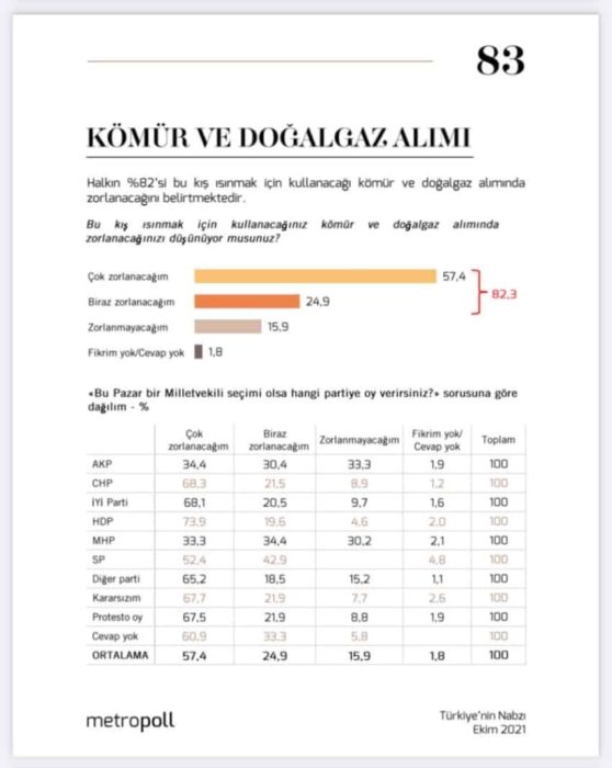 Buna göre bu kış ısınmak için kömür ve doğalgaz alımında ‘çok zorlanacağını’ belirtenlerin oranı yüzde 57,4, ‘biraz zorlanacağını’ söylenlerin oranı ise yüzde 24,9 oldu. ‘Zorlanmayacağını’ söylenlerin oranı ise yüzde 15,9.