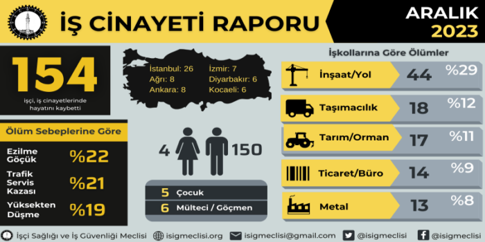 Rapor, iş cinayetlerinin en çok inşaat, yol, taşımacılık, tarım, orman ve madencilik işkollarında meydana geldiğini gösteriyor. İş cinayetlerinin en yaygın nedenleri arasında ise yüksekten düşme, trafik kazaları, kalp krizi ve zehirlenme yer alıyor.
