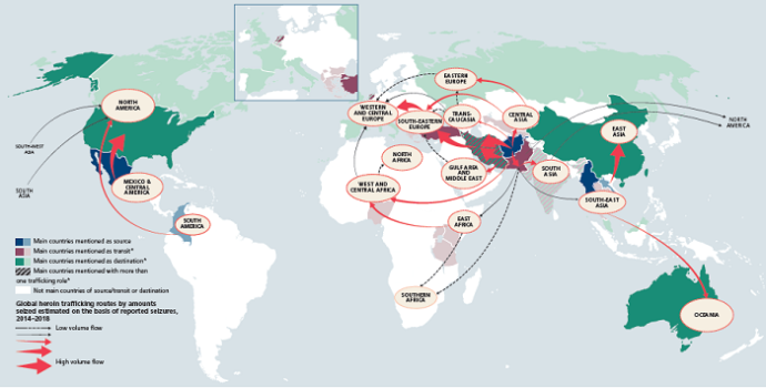 COVID-19 ile ilgili kısıtlamaların Afganistan’ı İran İslam Cumhuriyeti, Türkiye ve Güney-Doğu Avrupa’daki Balkan ülkeleri üzerinden Batı ve Orta Avrupa’daki pazarlara bağlayan dünyanın en önemli eroin kaçakçılığı rotası olan Balkan rotası üzerinde ciddi bir etkisi olmadığı 2021 yılı raporunun bulguları arasında. 2019’da dünyada en fazla eroin ele geçirilen ülke 20 ton ile Türkiye olurken Türkiye’yi; 17 tonla İran, 8 tonla Pakistan ve ABD, 6 ton ile Çin takip ediyor.