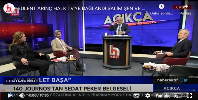Halk TV ekranlarında yayınlanan Gökmen Karadağ ile Açıkça programına bağlanan AKP’nin kurucularından olan, eski Cumhurbaşkanlığı Yüksek İstişare Kurulu üyesi Bülent Arınç, hukukçu Salim Şen ve gazeteci Barış Pehlivan ile tartıştı. Arınç, 140journos’un belgeselinde yer alan ve devletle ilgili görüşlerini aktaran ve belgeselin Sedat Peker’le ilgili olduğunu bilmediğini öne sürdü.