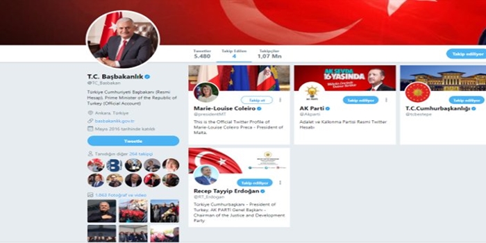 Çok yerli ve milli Başbakanımız, Resmi Başbakanlık hesabından dünya liderlerini takip etmiyor. Dünya bir yana, off-shore hesapları bir yana… Cumhuriyet Gazetesi‘nin haberine göre başbakanlığın Resmi twitter hesabından takip ettiği dört isimden biri, off-shore hesaplarının olduğu Malta Cumhurbaşkanı. Diğer üç hesapta, Erdoğan ve AKP’nin resmi hesapları…