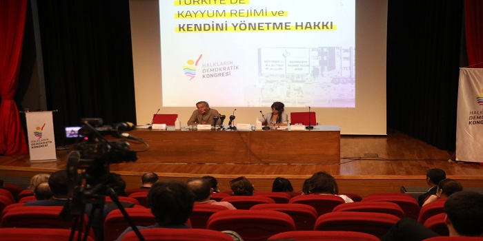 Halkların Demokratik Kongresi (HDK), İstanbul Şişli’de bulunan Nazım Hikmet Kültür Merkezi’nde “Türkiye’de Kayyum Rejimi ve Kendini Yönetme Hakkı” konulu panel düzenledi. HDK Eş Sözcüsü Esengül Demir, Halkların Demokratik Partisi (HDP) milletvekilleri Sezai Temelli, Musa Piroğlu ve Dilan Dirayet Taşdemir, KONDA Genel Müdürü Bekir Ağırdır, Kamu Emekçileri Sendikaları Konfederasyonu (KESK) Eş Genel Başkanı Mehmet Bozgeyik, Boğaziçi Üniversitesi Öğretim üyesi Erol Köroğlu, Boğaziçi Öğrencileri ile çok sayıda kişi panele katıldı.