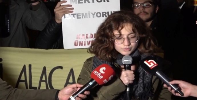 Eylemde, Boğaziçi Üniversitesi’nin ikinci kayyum rektörü Naci İnci’yi protesto ettikleri gerekçesiyle tutuklu olan Enis Berke Gök ve Caner Perit Özen’in cezaevinden gönderdikleri mesajlar da okundu.
