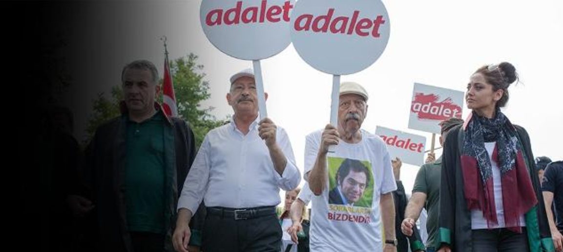 Yürüyüşe, herkes gibi adalete hasret bir vatandaş, adaletin yokluğunun ve baskının bedelini ilk ödeyecek meslek dalının mensubu, geçmişte adaletsizliğin bedelini özgürlüğünen yoksun kalarak ödemiş bir gazeteci, sürekli baskı altında tutulan, saldırılara hedef olan, çalışanları, yöneticileri adalet mağduru olan Cumhuriyet gazetesinin bir mensubu olarak katıldığıma göre Silivri’deki Cumhuriyetçiler Akın Atalay, Murat Sabuncu, Kadri Gürsel, Güray Öz, Hakan Kara, Turhan Günay, Musa Kart, Önder Çelik, Bülent Utku, M. Kemal Güngör, Ahmet Şık, Y . Emre İper’i de temsil etmek üzere orada bulunuyorum. Bunu vurgulamak üzere, Kadri Gürsel’in Galatasaray’dan sınıf arkadaşları 114. dönem mezunlarının Kadri için yaptırdıkları, üzerinde resmi olan ve “Sorarlarsa bizdendir” yazan, tişörtü giyiyorum. Bir ara Adalet Yürüyüşü’nde ön safta Kılıçdaroğlu’nun yanında Kadri yürüyormuş gibi oluyor. Kılıçdaroğlu’nun dillendirdiği adalet istemine yediden yetmişe kadın-erkek birçok vatandaş yürekten katılıyor. Bunu sokaktaki insanların tepkisinden anlıyorsunuz.