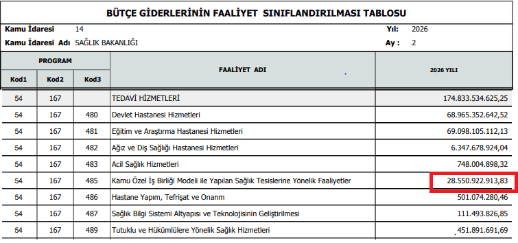 Tabloda bu kalem, “Kamu Özel İş Birliği Modeli ile Yapılan Sağlık Tesislerine Yönelik Faaliyetler” başlığı altında yer alıyor. Bu model kapsamında inşa edilen şehir hastaneleri, devletin özel şirketlerle yaptığı uzun vadeli kira ve hizmet sözleşmeleri üzerinden finanse ediliyor.