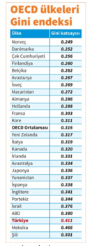 OECD ülkeleri arasında gelir dağılımı adaletsizliğinde 3’üncü sırada yer alan Türkiye’nin Gini katsayısı (0.411), OECD ortalamasının (0.316) bir hayli üzerindedir.Bununla birlikte, Türkiye maalesef küresel ekonomik krizden ciddi şekilde etkilenmiş olan İtalya, İspanya, Yunanistan ve Portekiz gibi Avrupa ülkelerinden daha yüksek bir gelir dağılımı eşitsizliğine sahiptir. Diğer taraftan, Türkiye’ye ilişkin karşılaştırmalı göstergeler bununla da sınırlı değildir. Türkiye’de göreli yoksulluk oranı % 19,3 iken OECD ortalaması % 11,1. Ayrıca, Türkiye nüfusunun en zengin % 10’luk kesiminin sahip olduğu gelir, en yoksul % 10’luk kesimin elde ettiği gelirin 15 katına denk gelmektedir. Bu oranın OECD’de ortalama 9,8 olduğu görülüyor. [3]