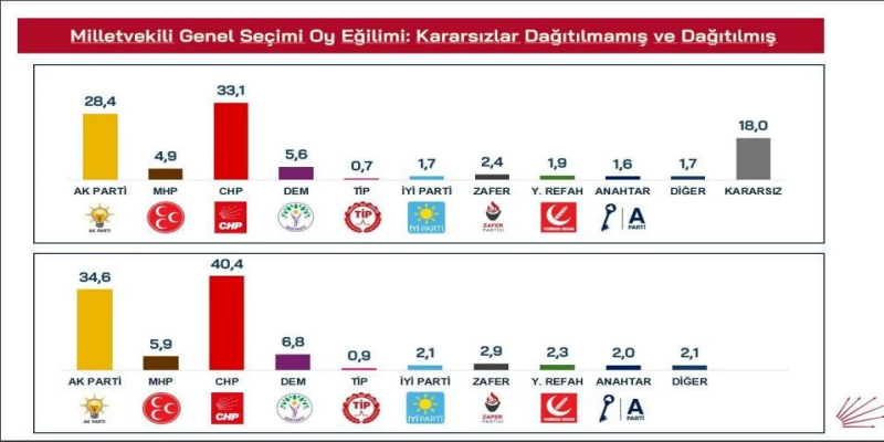 Kararsız seçmenlerin eğilimlerine göre dağıtılmasıyla oluşan tablo ise CHP lehine güçlü bir değişim ortaya koyuyor: