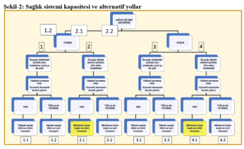 Mevcut kapasite normal durumlara göre yüksek de olsa, salgın durumumda kapasite kısa sürede aşılacağı için, insanların birbiri ile temasını azaltacak fiziksel önlemlerin alınması yine de kaçınılmazdır. Ancak bu durumda alınan önlemlerin niteliğini ve zamanlamasını tercih etmek için kamu otoritesinin hareket alanı olacaktır. Zira fiziksel önlemlerin sınırlı tutulması, ekonomik resesyonun çok daha derin olmasını engelleyebilir, daha sınırlı ekonomik destek paketleri ile kamu politikasının her iki hedefine de varılabilir (Şekil-2’deki 2.1 numaralı sonuç).
