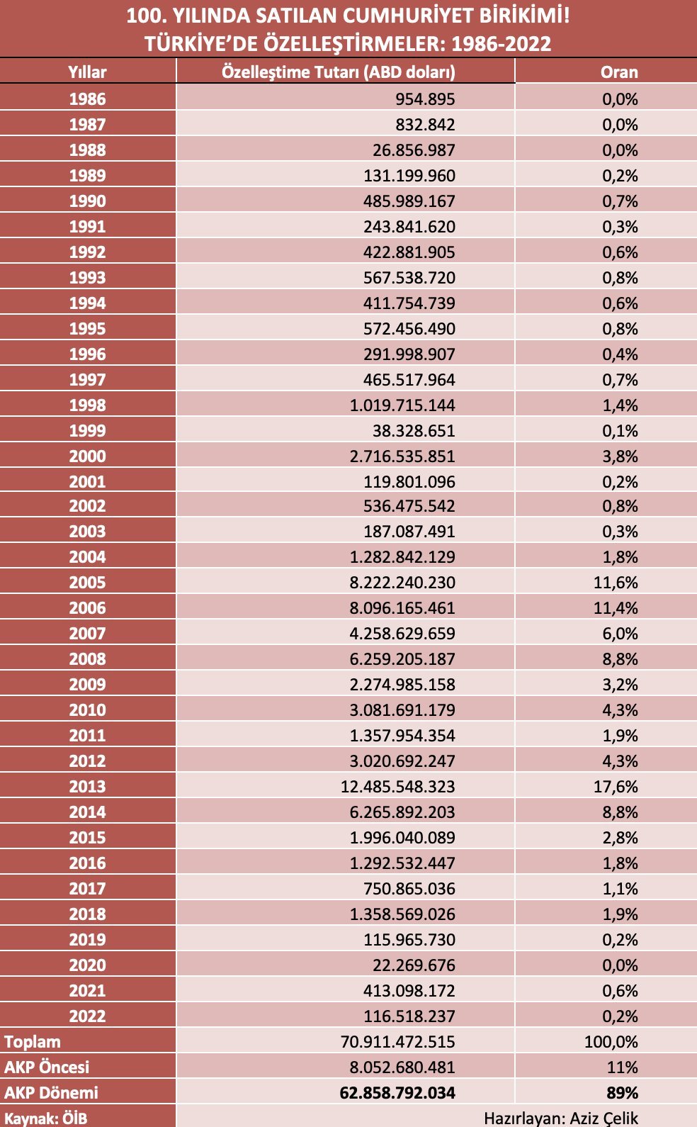 Ekonomist Aziz Çelik’in paylaştığı resmi verilere göre, Türkiye’de 1986’dan 2022’ye kadar yapılan özelleştirmelerin toplam tutarı 70,9 milyar dolara ulaştı; bu satışların yüzde 89’u AKP iktidarları döneminde gerçekleşti ve Cumhuriyet’in onlarca yılda oluşturduğu kamusal varlıkların büyük bölümü el değiştirdi.