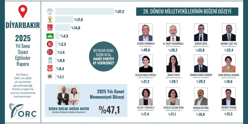 ORC Araştırma’nın 2025 yılı boyunca Diyarbakır’da yaptığı dokuz ayrı çalışmanın derlendiği rapor, seçmen tercihlerinde DEM Parti’nin açık üstünlüğünü koruduğunu, milletvekilleri ve belediye yönetimine yönelik görev onaylarının ise parti aidiyetinden bağımsız, isim bazında farklılaştığını ortaya koydu.