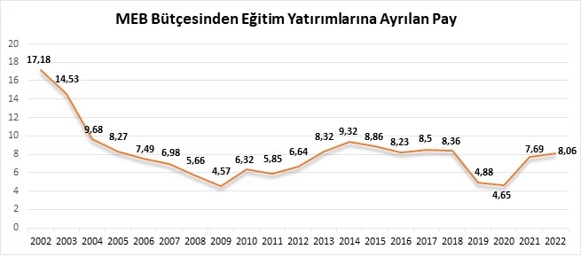 2002-2022 yılları itibarıyla MEB bütçesinden eğitim yatırımlarına ayrılan payın gelişim seyri, her fırsatta “Bütçeden aslan payını eğitime ayırdık” diyenlerin halkı nasıl yanılttıklarını açıkça göstermektedir.