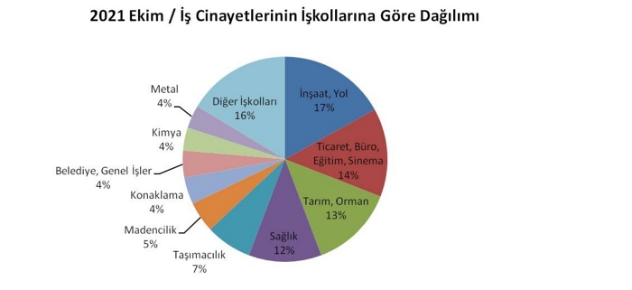 Ölümler en çok inşaat/yol, ticaret/büro/eğitim/sinema, tarım/orman, sağlık, taşımacılık, madencilik, konaklama, belediye/genel işler, kimya, metal, gıda, gemi/tersane, güvenlik ve enerji işkollarında meydana geldi.