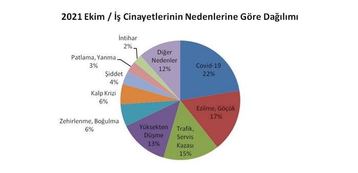 En fazla ölüm nedenleri Covid-19, ezilme/göçük, trafik/servis kazası, yüksekten düşme, zehirlenme/boğulma, kalp krizi, şiddet, patlama/yanma, intihar, elektrik çarpması ve kesilme/kopma.