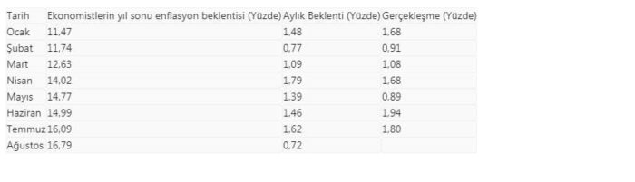 Öte yandan, ekonomistlerin yıl sonu enflasyon beklentisi, bir önceki ankete göre 70 baz puan artarak yüzde 16,79’a yükseldi.
