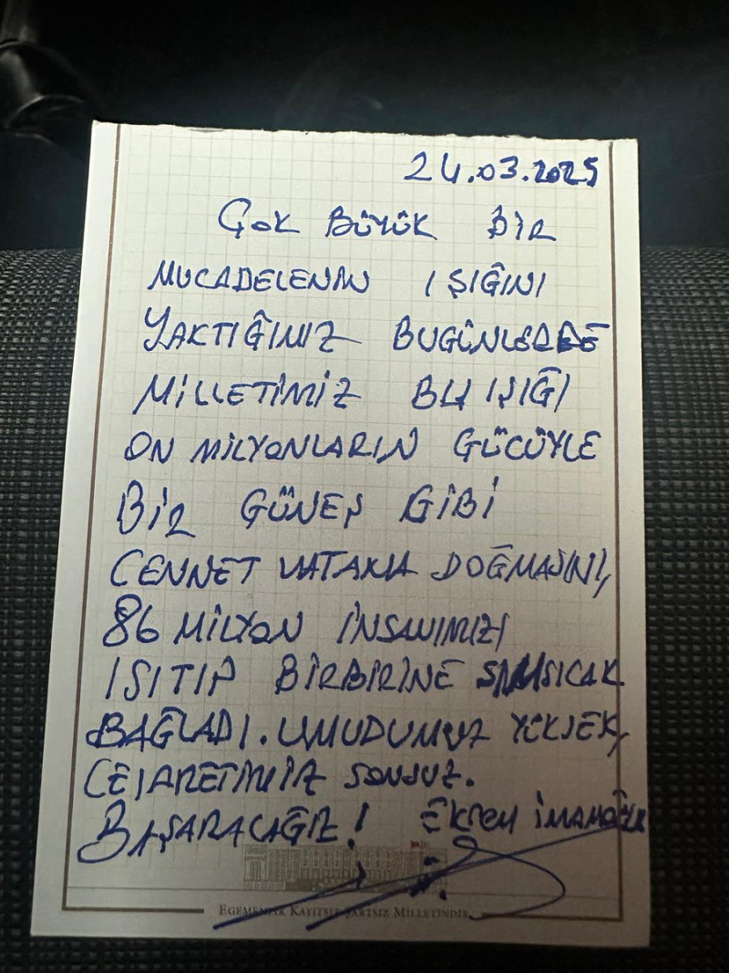 Torun, Silivri Cezaevi’nde gerçekleştirdiği ziyaretin ardından İmamoğlu’nun el yazısıyla kaleme aldığı mesajı sosyal medya hesabından paylaştı. Torun, açıklamasında, İmamoğlu’nun 2019 yerel seçim sürecinde başlattığı mücadelenin halkın desteğiyle büyüyerek devam ettiğini vurguladı.