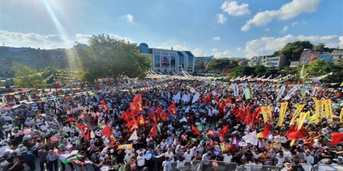 Neden İstanbul’dan başladık çünkü bu zulüm ve yıkım iktidarı İstanbul’u faşizmin üssü yapmak istiyor. Türkiye’ye giydirmek istedikleri rejimi burada pişirmek istiyorlar ama biz dedik ki: ‘Hayır, İstanbul faşizme karşı dimdik duracak ve bunu bu meydanda gösterecek’ dedik, İşte gösteriyoruz hep birlikte. ‘İstanbul’u emeğin ve özgürlüğün, demokrasinin üssü yapacağız’ dedik. İşte sözümüzün karşılığı sizin yüreklerinizin gümbür gümbür sesidir. Geliyor Emek ve Özgürlük İttifakı. Bütün baskılara, sömürüye, savaş politikalarına, polis baskınlarına kumpas davalarına rağmen HDP ile birlikte yürüyor Emek ve Özgürlük İttifakı. Büyüyerek geliyor. Bu ülkeyi güzelleştirmeye geliyor, bu iktidarı göndermeye geliyor, bu düzeni değiştirmeye geliyor Emek ve Özgürlük İttifakı.