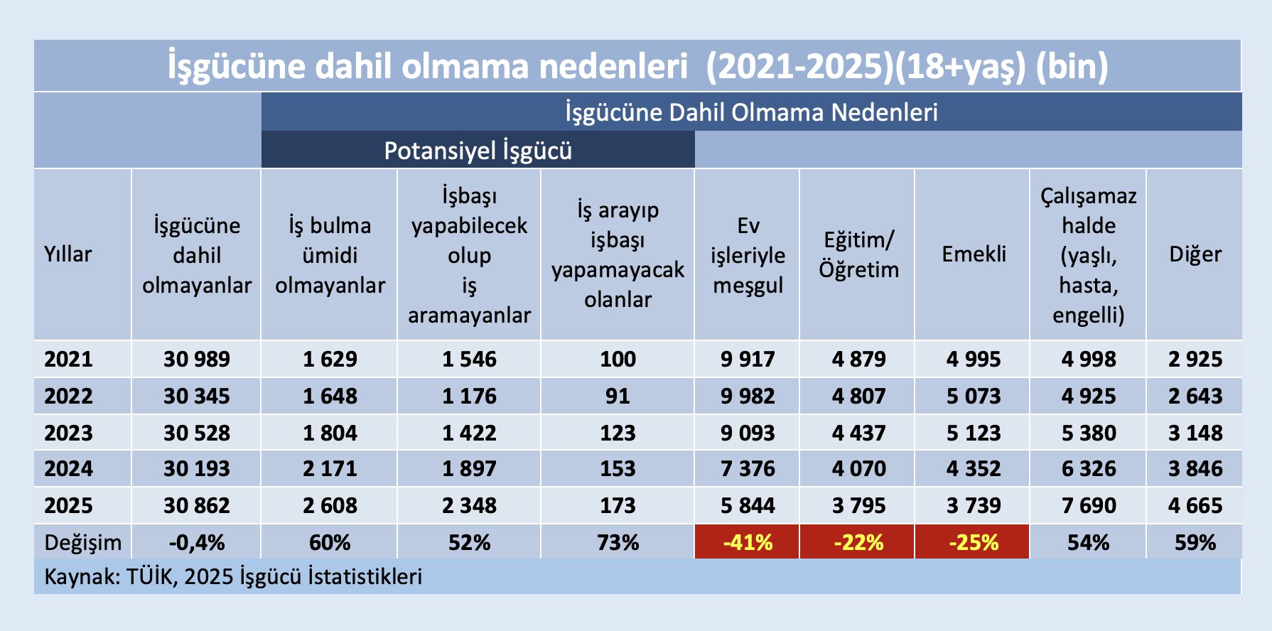 Veriler, klasik olarak işgücüne katılmama gerekçeleri arasında yer alan emeklilik, eğitim ve ev içi sorumlulukların ağırlığının azaldığını ortaya koyuyor.