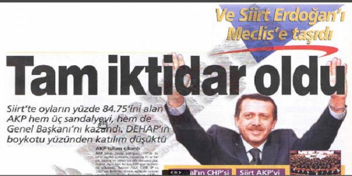 3 Kasım 2002 tarihinde yapılan milletvekili sonuçlarının açıklanmasından sonra, Yüksek Seçim Kurulu’nun 8 Aralık 2002 tarihinde Siirt’teki seçimlerin iptali ve yenilenmesi doğrultusunda aldığı karar, Türkiye siyasetinde yeni bir dönemin başlamasına vesile olurken; aynı yılın sonunda yapılan Anayasa değişiklikleri ile Tayyip Erdoğan’a önce parlamento, sonra da genel başkanlık yolu açılacaktır.