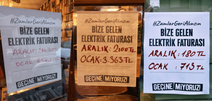 Esnaf gelen fahiş faturaları camlarına asmaya başladı. ‘Enerji şirketlerin cebi dolarken kendilerinin soyulduğunu’ ifade eden esnaf “Zamlar geri alınsın” dedi.