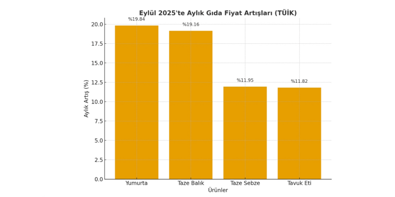 TÜİK verilerine göre eylülde yumurtayı, aylık bazda taze balık (%19,16), taze sebze (%11,95) ve tavuk eti (%11,82) gibi ürünler takip etti. Sebze-meyve grubunda mevsimsel dalgalanmalar ve zirai koşullardaki bozulmalar fiyatların yukarı gitmesinde rol oynadı. Bu tablo hem kent hem de kır hane halklarının gıda harcamasında keskin bir yük artışı anlamına geliyor.