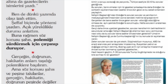 Gazeteci Faruk Bildirici, Hürriyet Genel Yayın Yönetmeni Ahmet Hakan’ın kendisine yönelik sözlerine sosyal medya hesabından sert bir açıklamayla karşılık verdi. Bildirici, Cumhurbaşkanlığı uçağında gazetecilere yöneltilen soruların önceden belirlendiğini iddia ettiği paylaşımının çarpıtıldığını savundu.