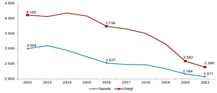 Türkiye İstatistik Kurumu’nun (TÜİK) 2021 yılı yazılı medya ve uluslararası standart kitap numarası istatistiklerine göre, gazete ve dergi sayısı, 2021 yılında 2020 yılına göre yüzde 6 azalarak 4 bin 460 oldu. Bu yayınların yüzde 53,6’sını dergiler oluşturdu.