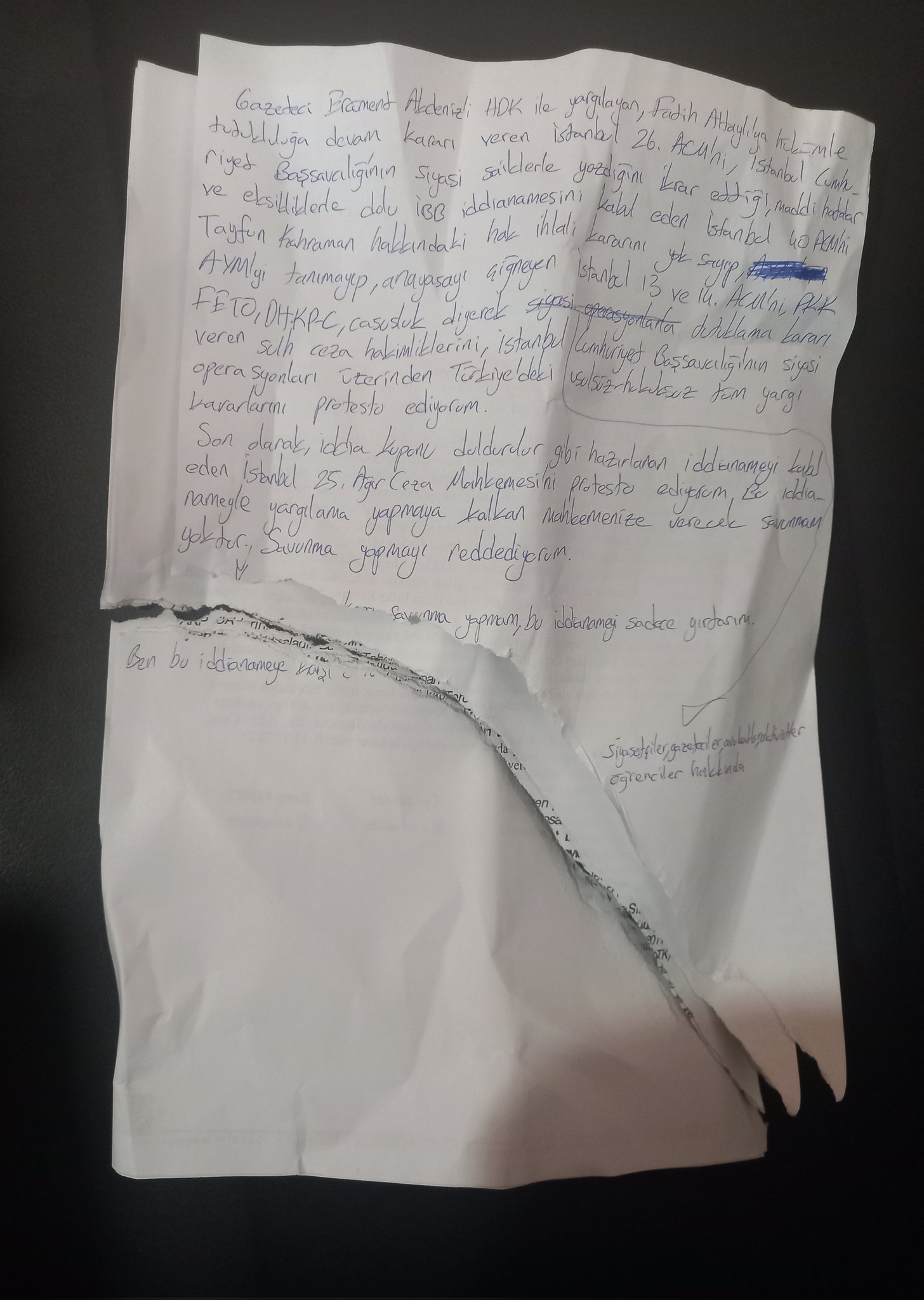 Bu tartışma, uzun süredir ifade özgürlüğü alanındaki baskılar ve yargılama usullerine dair eleştirileri yeniden görünür kıldı. Karabay, iddianameyi “bahis kuponu gibi hazırlanmış” sözleriyle nitelendirerek, metni elinde yırttı: