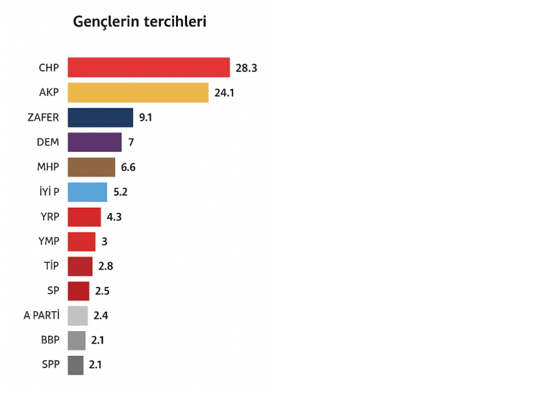 Ankete katılan gençlere “Bu pazar genel seçim olsa hangi partiye oy verirsiniz?” sorusu yöneltildi. Sonuçlar, Cumhuriyet Halk Partisi’nin (CHP) genç seçmenler arasında bir kez daha önde olduğunu gösterdi. Katılımcıların yüzde 28.3’ü CHP’yi tercih ederken, Adalet ve Kalkınma Partisi’ni (AKP) destekleyen gençlerin oranı yüzde 24.1 seviyesinde kaldı. Bu durum, gençler arasındaki oy dağılımında CHP’nin AKP’ye göre önemli bir fark elde ettiğini ortaya koydu.