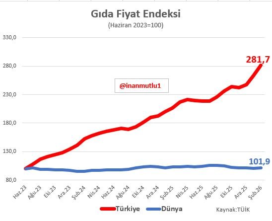 Ekonomist İnan Mutlu’nun paylaştığı grafik, Türkiye’de gıda fiyatlarının son iki yılda küresel eğilimden dramatik biçimde ayrıştığını ortaya koyuyor: Haziran 2023’ten bu yana dünyada gıda fiyatları yaklaşık yüzde 2 artarken Türkiye’de artış yüzde 182’ye ulaştı.