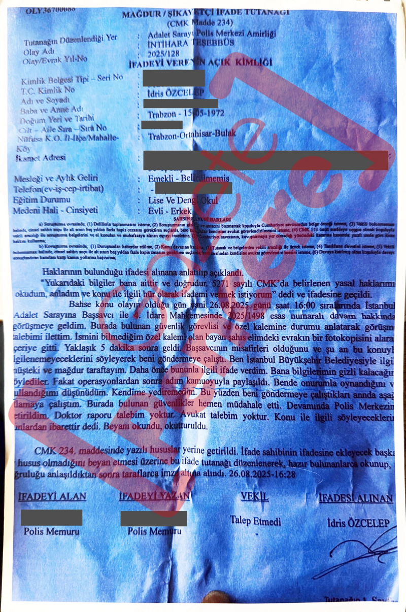 CHP lideri Özgür Özel’in kamuoyuna taşıdığı “Çağlayan’da gizli tanık intihara kalkıştı” iddiasının ardından, intihar girişiminde bulunan İdris Özcelep’in polis ifadesi ortaya çıktı; Özcelep, kendisine kimliğinin gizli tutulacağı sözünün verildiğini, ancak adının kamuoyuna yansımasıyla “onurunun zedelendiğini” ve bu nedenle intihara teşebbüs ettiğini söyledi.