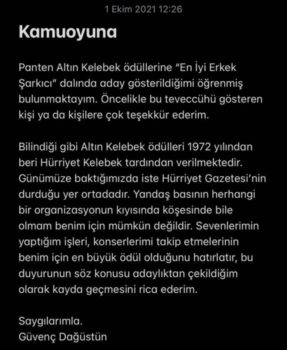 Twitter’dan yazılı açıklama yayınlayan sanatçı, ‘En iyi erkek şarkıcı’ ödülüne aday gösterildiğini belirterek, ‘bu teveccühü gösteren kişi ya da kişilere’ teşekkür ettiğini ifade etti.