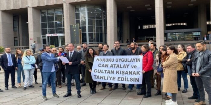 Özgürlük için Hukuçular (ÖHD), Çağdaş Hukukçular Derneği (ÇHD), Toplumsal Hukuk, Demokrasi için Hukukçular, Hukukçu Dayanışması ve Adalet İçin Hukukçular, CMK’de belirtilen en üst tutukluluk süresi dolmasına rağmen tahliye edilmeyen Gültan Kışanak ve Anayasa Mahkemesi (AYM) kararına rağmen tahliye edilmeyen Hatay Milletvekili Can Atalay için Sıhhiye’de bulunan adliye önünde basın açıklaması gerçekleştirdi. Açıklamada “Hukuk uygulansın Can Atalay ve Gültan Kışanak serbest bırakılsın” pankartı açıldı.