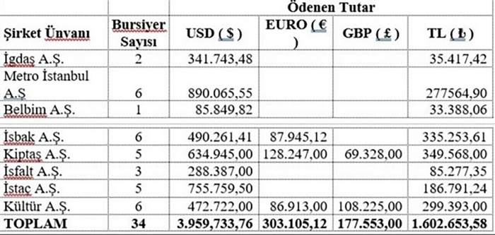 O dönem şirketlerin bursiyerlere yaptığı ödemelerin tablosu da şöyle: