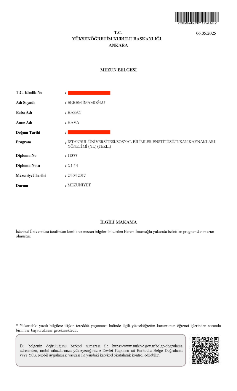 Pehlivan’ın açıklamasına göre, diplomanın sistemden silinmesiyle birlikte hukuk dışı bir sürecin yürütüldüğü açıkça görülüyor. Ancak Pehlivan’a göre asıl dikkat çekici unsur, lisans diploması silinirken İmamoğlu’nun yüksek lisans diplomasının sistemde kalmaya devam etmesi. Bu durum, idari sürecin ne denli özensiz ve tutarsız yürütüldüğünün bir göstergesi olarak değerlendiriliyor.