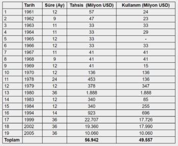 Tabloya göre bugüne kadar IMF, Türkiye’ye 19 stand by düzenlemesi eşliğinde toplam 56,9 milyar dolar destek tahsis etmiş, Türkiye, bu toplamın 49,6 milyar dolarlık bölümünü kullanmıştır. 1980 yılına gelene kadarki kullanımlar son derecede düşüktür. Çünkü unutmamak gerekir ki Türkiye’nin o tarihlere kadar başlıca ihraç ürünleri fındık, kuru üzüm, incir gibi tarımsal ürünler ve az sayıda sanayi ürünüdür. Hava koşulları kötü gidip de mahsul düşük olunca ihracat düşmekte, Türkiye ödemeler dengesi sıkıntısına girip ithalat yapamaz konuma gelince IMF’nin kapısını çalmaktadır. 25 – 30 milyon dolarlık desteklerle ekonominin kalkınmasını beklemek tuhaf olur. 1980 yılındaki nispeten büyük destek 24 Ocak kararları ve ekonominin 70 cent’e muhtaç halden kurtarılması amacına dönüktür. 1994 yılındaki destek tümüyle o yıl yaşanan ve büyük ölçüde kendi hatalarımızdan kaynaklanan krizden kurtulmak için alınmıştır. 1999 sonunda başlayan ve 2008 yılında sonuçlanan kredilerin kullanımı ise 2001 krizine giden gelişmeler, 2001 krizi ve sonrası için kullanılmıştır.