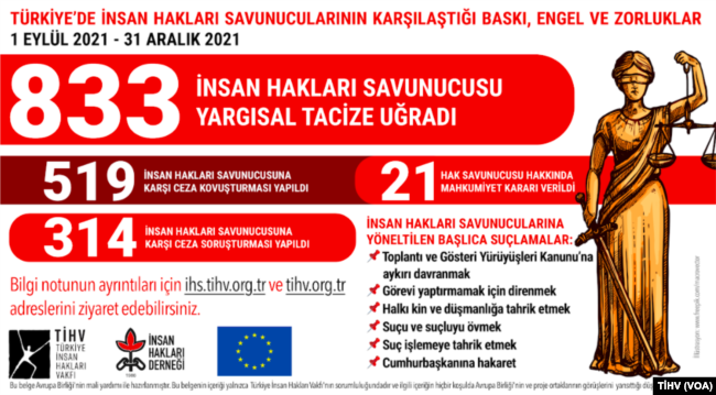 Türkiye İnsan Hakları Vakfı (TİHV), insan hakları savunucularının karşılaştığı baskı ve zorluklarla ilgili raporunu açıkladı. TİHV, 2021 yılının son dört ayında en az bin 220 insan hakları savunucusunun baskı ve engellerle karşılaştığını bildirdi.