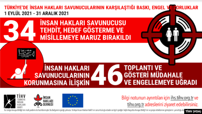 1 Eylül ile 31 Aralık 2021 tarihleri arasını kapsayan ‘İnsan Hakları Savunucularının Karşılaştığı Baskı, Engel ve Zorluklara İlişkin Bilgi Notu’nda, ‘’İnsan hakları savunucuları temelsiz suçlamalarla yargılandılar, cezalandırıldılar. İdari kararlarla işlerinden, faaliyetlerinden uzaklaştırıldılar. Hedef gösterildiler, tehdit ve misillemelere maruz kaldılar’’ denildi.
