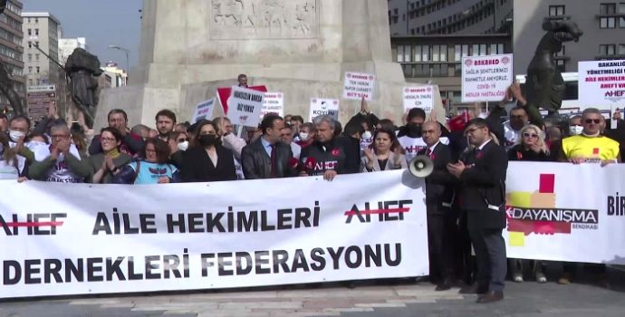 Aile Hekimleri Dernekleri Federasyonu, Aile Hekimliği Çalışanları Sendikası, Ankara Aile Hekimleri Derneği, Aile Sağlığı Çalışanları Federasyonu, Birlik Dayanışma Sendikası, Genel Sağlık İş Sendikası, Hekim Sen Sendikası, Hekim Birliği Sendikası, Hürriyetçi Sağlık Sen, Tabip Sendikası, iki gün süreyle iş bırakan hekimler ve aile sağlığı merkezi çalışanlarının taleplerini dile getirmek için bugün Ulus Meydanı’nda ortak bir basın açıklaması yaptı. Eyleme CHP Tekirdağ Milletvekili Candan Yüceer de destek verdi.