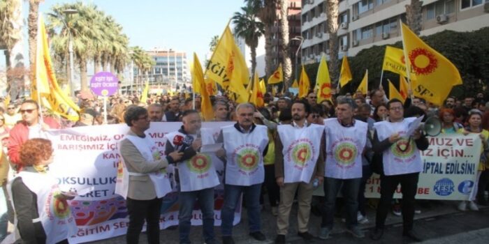Eylemde “Mesleğimizin onuru öğrencilerimizin geleceği için iş bıraktık” pankartı açan emekçiler, “Eşit işe eşit ücret”, “İş emek özgürlük”, “Bölemezsin de gidemezsin” sloganları attı.