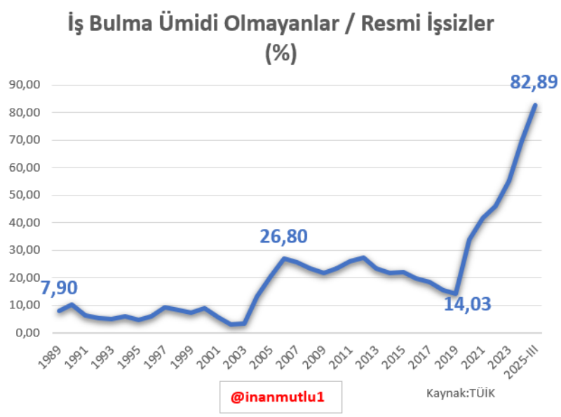 Grafiklere göre, iş bulma ümidi olmadığı için iş aramayanların resmi işsizlere oranı 2025 itibarıyla yüzde 82,9 seviyesine ulaştı. Bu oran, 1989’da yüzde 7,9, 2006’da ise yüzde 26,8 düzeyindeydi. Özellikle 2019 sonrasında yaşanan keskin yükseliş, işgücü piyasasında yapısal bir kırılmaya işaret ediyor.