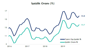 İşsizlik oranına iş aramayıp çalışmaya hazır olanlar ile mevsimlik çalışanları dahil ettiğimizde geçtiğimiz yılın Aralık ayında yüzde 19,6 olan geniş tanımlı işsizlik oranı 2019 sonunda yüzde 20,2’ye yükselirken işsiz sayısı 232 bin kişi artarak 6 milyon 984 bine yükseldi. Zamana bağlı eksik