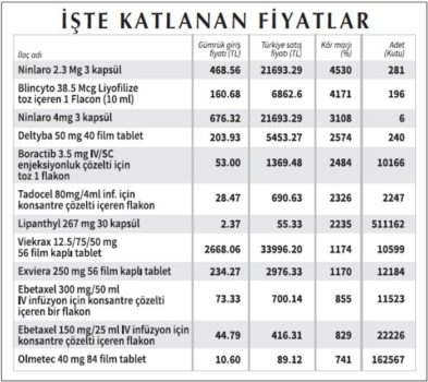 Yapılan incelemede Sayıştay, söz konusu ilaçların gümrükten giriş fiyatları ile Türkiye’de izin verilen nihai satış fiyatları arasında 46.3 kata varan farklar tespit etti. Yani fiyatlar arasında yüzde 4 bin 530 kâr marjı bulunduğu görüldü. Raporda 12 ilacı ithal eden firmalar ile bu ilaçları satın alan firmaların yüzde 90’ının aynı firma olduğu belirtildi. İlaçların genellikle kanser tedavisinde kullanılan ilaçlar olduğuna dikkat çekilen raporda “bu ilaçların pahalı ilaçlar olması nedeniyle kâr marjlarındaki çok küçük bir farkın bile hastanelere ve SGK’ye çok büyük maliyetle getiriyor” ifadeleri kullanıldı.