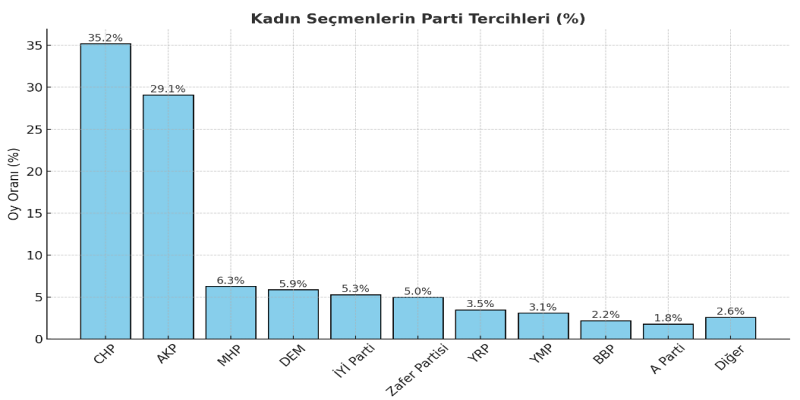 Sonuçlara göre, kadın seçmenlerin en çok tercih ettiği parti Cumhuriyet Halk Partisi (CHP) oldu. Katılımcıların yüzde 35,2’si oyunu CHP’den yana kullanacağını belirtti.