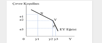 Dikey eksende çevre koşulları yer alıyor (bunu bir endeksle ölçtüğümüzü ve endekste hava kirliliği, sularda kirlenme, ekilebilir toprakların azalması gibi çevre değerlerinin yer aldığını varsayalım.) Yatay eksende de gelir (GSYH) reel olarak yer alıyor. Şekil bize gelir artışının yani ekonomik büyümenin çevre koşullarını bozarak sağlandığını anlatıyor. Başlangıçta X dengesinden Y dengesine geçilirken çevre koşullarındaki bozulma artışına karşılık ekonomik büyümede çok daha fazla artış ortaya çıkarken ilerleyen dönemlerde çevre koşullarında bozulmanın birikimli olumsuz etkisiyle bu durum tersine dönüyor. Çevre koşullarıyla ekonomik büyümeyi birlikte gösteren EY Eğrisinin Y noktasından sonra daha katı bir hal almasının nedeni budur. Y noktasından sonra ekonomi büyümeye devam ettikçe (Z noktası) çevre koşullarında daha büyük bozulmalara (e2’den e3’e geçiş) karşılık ekonomik büyümede çok daha düşük artışlar (y2’den y3’e geçiş) ortaya çıkabilmektedir.